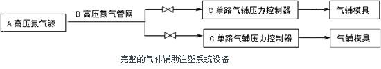 完整的氣輔注塑系統(tǒng),應由A高壓氮氣源設備、 B高壓氮氣傳輸管道及C氣輔壓力控制器三部分組成。